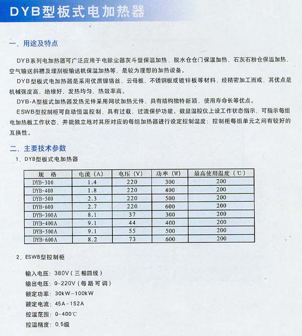 DYB型板式點加熱器是采用優質鎳鉻絲,云母板,不銹鋼板或鍍鋅板等材料,經精密加工而成,其優點是機械強度高,絕緣好,發熱均勻,熱效率高。